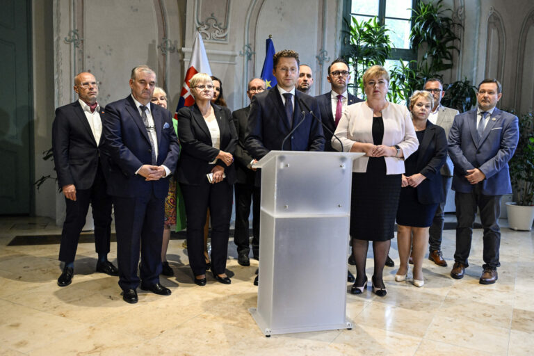 Prezident SR Peter Pellegrini (uprostred v popredí) počas vyhlásenia prezidenta SR po stretnutí s predstaviteľmi zdravotníctva v Prezidentskom paláci. Bratislava, 8. október 2024. Foto: SITA/Milan Illík