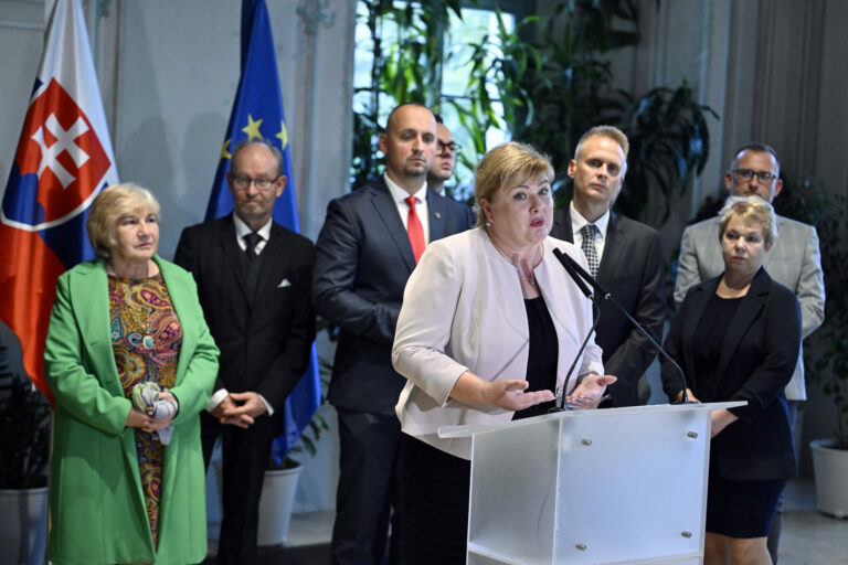 Sprava v popredí: Predsedníčka OZ SaPA Monika Kavecká a predseda Lekárskeho odborového združenia Peter Visolajský počas vyhlásenia po ukončení stretnutia predstaviteľov zdravotníctva s prezidentom SR Petrom Pellegrinim v Prezidentskom paláci. Bratislava, 8. október 2024. Foto: SITA/Milan Illík