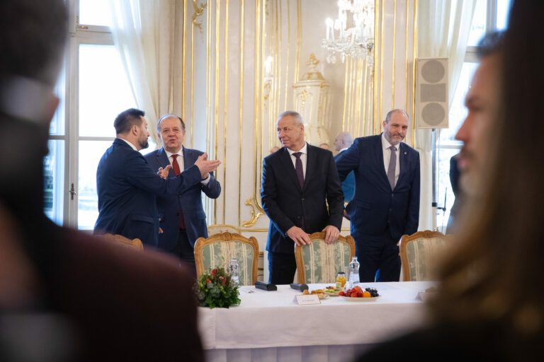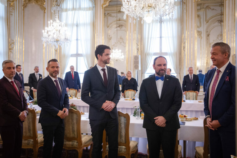 Zľava: Primátor Bratislavy Matúš Vallo, primátor Trenčína Richard Rybníček, primátor Banskej Bystrice Ján Nosko a primátor Košíc Jaroslav Polaček počas stretnutia prezidenta SR so zástupcami samospráv v Prezidentskom paláci. Bratislava, 31. január 2025. Foto: SITA/Diana Černáková
