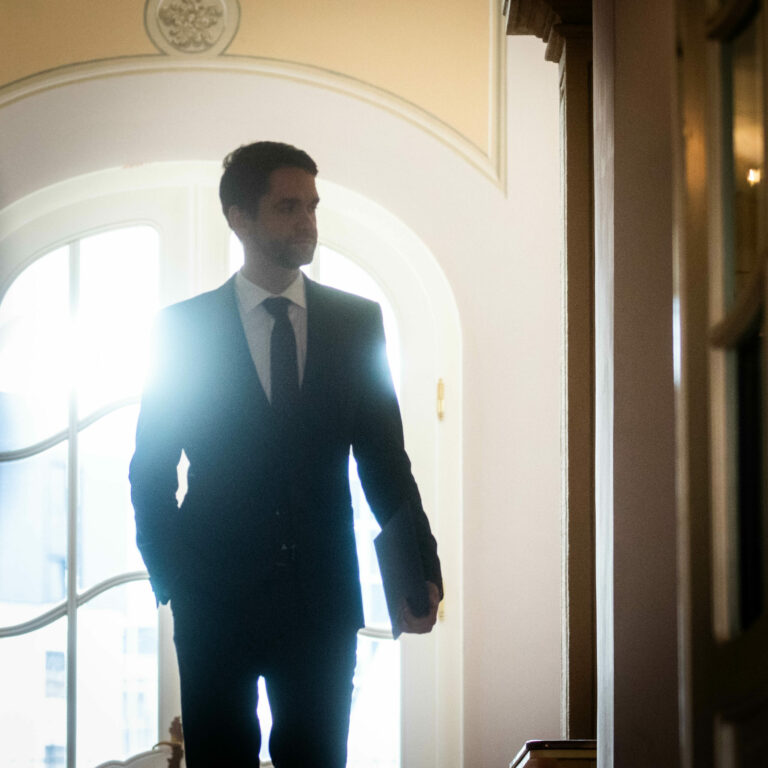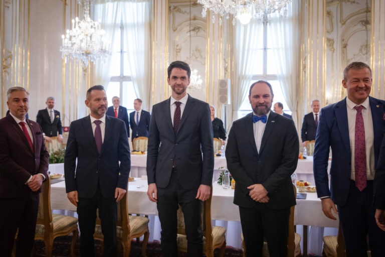 Sprava: štátny tajomník Ministerstva vnútra SR Patrik Krauspe, prezident SR Peter Pellegrini, štátny tajomník Ministerstva investícií, regionálneho rozvoja a informatizácie SR Michal Kaliňák a výkonný riaditeľ Prezidentského paláca Peter Vodráška počas stretnutia prezidenta SR so zástupcami samospráv v Prezidentskom paláci. Bratislava, 31. január 2025. Foto: SITA/Diana Černáková