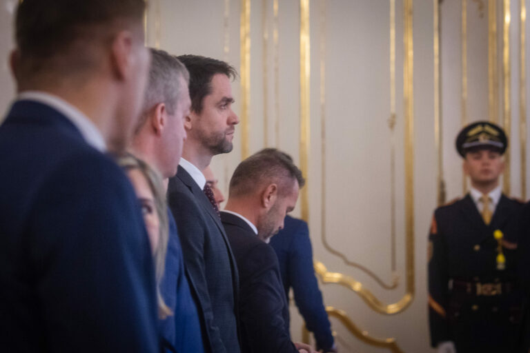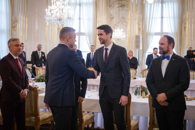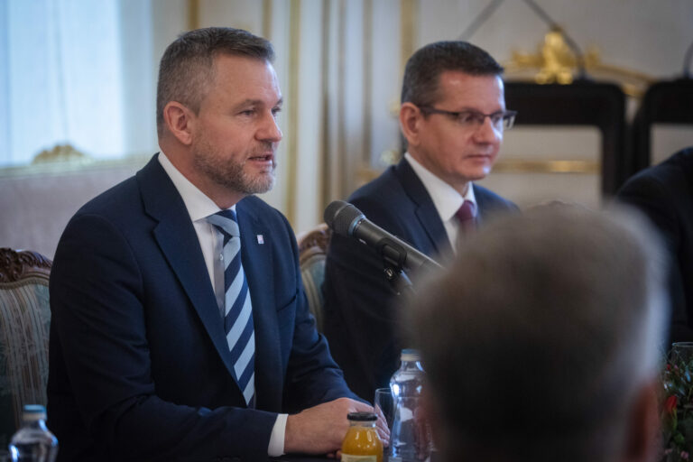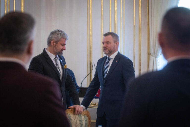 Zľava: Prezident SR Peter Pellegrini a štátny tajomník Ministerstva vnútra SR Patrik Krauspe počas stretnutia prezidenta SR so zástupcami samospráv v Prezidentskom paláci. Bratislava, 31. január 2025. Foto: SITA/Diana Černáková