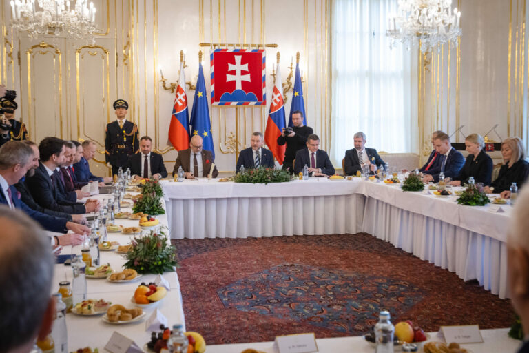 Uprostred zľava: Výkonný riaditeľ Prezidentského paláca Peter Vodráška, štátny tajomník Ministerstva investícií, regionálneho rozvoja a informatizácie SR Michal Kaliňák, prezident SR Peter Pellegrini a štátny tajomník Ministerstva vnútra SR Patrik Krauspe počas stretnutia prezidenta SR so zástupcami samospráv v Prezidentskom paláci. Bratislava, 31. január 2025. Foto: SITA/Diana Černáková