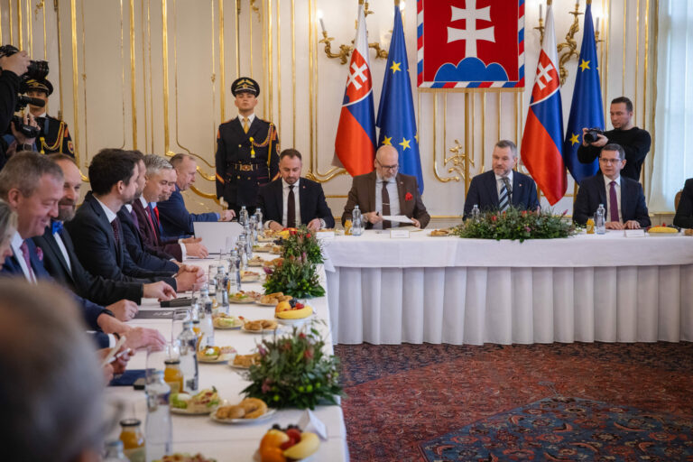 Zľava: Predseda Košického samosprávneho kraja Rastislav Trnka, prezident SR Peter Pellegrini, predseda Nitrianskeho samosprávneho kraja Branislav Becík, predseda Banskobystrického samosprávneho kraja Ondrej Lunter, predseda Trnavského samosprávneho kraja Jozef Viskupič a predseda Trenčianskeho samosprávneho kraja Jaroslav Baška počas stretnutia prezidenta SR so zástupcami samospráv v Prezidentskom paláci. Bratislava, 31. január 2025. Foto: SITA/Diana Černáková