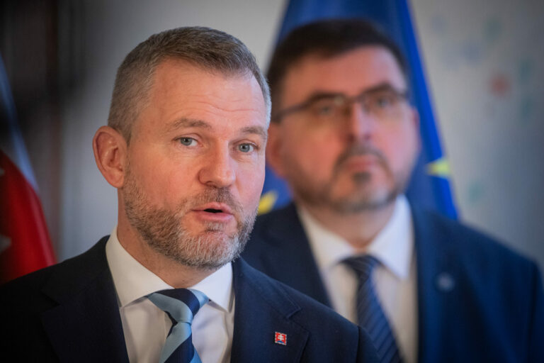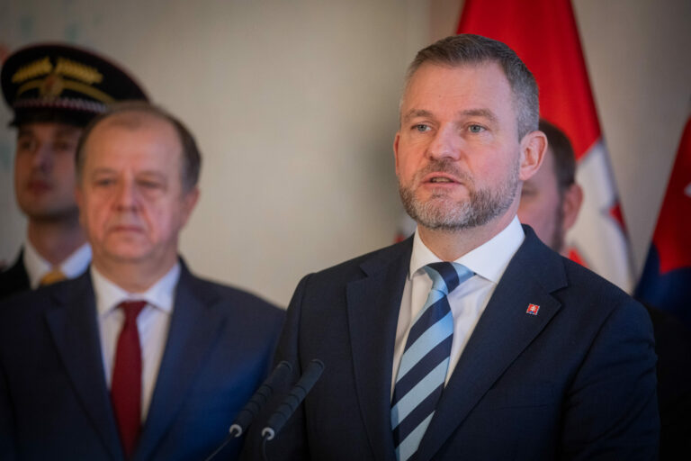 Prezident SR Peter Pellegrini (v popredí) počas tlačovej konferencie po stretnutí so zástupcami samospráv v Prezidentskom paláci. Bratislava, 31. január 2025. Foto: SITA/Diana Černáková