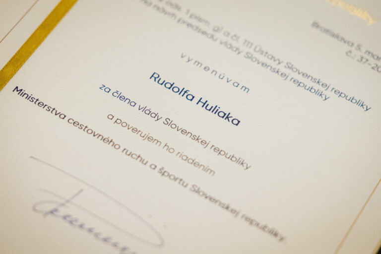 Menovací dekrét ministra cestovného ruchu a športu SR počas odvolania ministra cestovného ruchu a športu SR Dušana Keketiho a vymenovania nového ministra Rudolfa Huliaka prezidentom SR v Prezidentskom paláci. Bratislava, 5. február 2025. Foto: SITA/Kancelária prezidenta