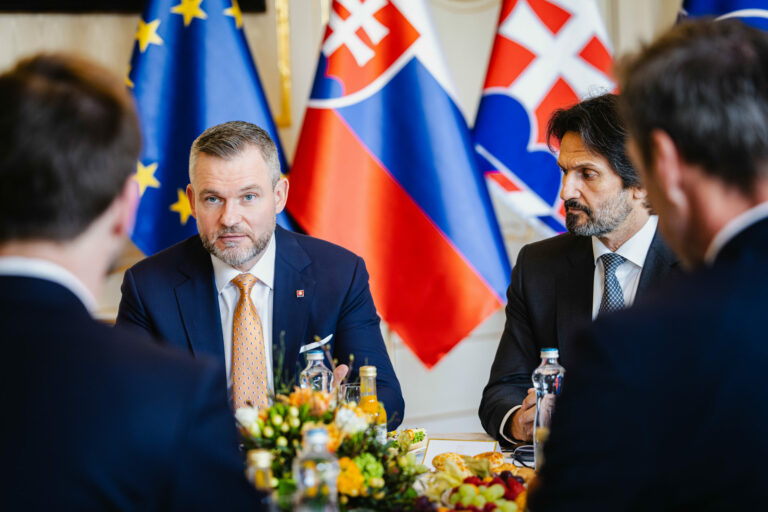 Prezident SR Peter Pellegrini a podpredseda vlády SR a minister obrany SR Robert Kaliňák počas okrúhleho stola k zvyšovaniu obranyschopnosti Slovenskej republiky a možnému navyšovaniu obranných výdavkov v Prezidentskom paláci. Bratislava, 26. marec 2025. Foto: SITA/Kancelária prezidenta