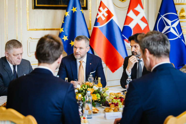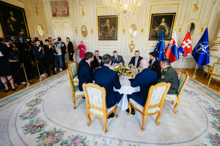 Zľava ya stolom: Predseda Progresívneho Slovenska (PS) Michal Šimečka, predseda Slovenskej národnej strany (SNS) Andrej Danko, predseda Kresťanskodemokratického hnutia (KDH) Milan Majerský, premiér SR Robert Fico, prezident SR Peter Pellegrini, predseda Strany Sloboda a Solidarita (SaS) Branislav Gröhling, podpredseda vlády SR a minister obrany SR Robert Kaliňák a náčelník generálneho štábu Ozbrojených síl (OS) SR Daniel Zmeko počas okrúhleho stola k zvyšovaniu obranyschopnosti Slovenskej republiky a možnému navyšovaniu obranných výdavkov v Prezidentskom paláci. Bratislava, 26. marec 2025. Foto: SITA/Kancelária prezidenta