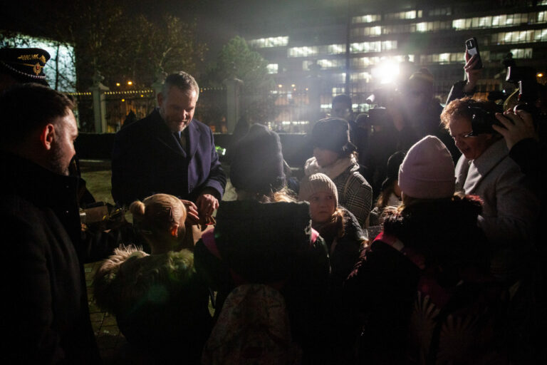 Prezident Peter Pellegrini (v pozadí vľavo) dáva dary deťom pri príležitosti slávnostného rozsvietenia vianočného stromčeka na nádvorí Prezidentského paláca. Bratislava, 6. december 2024. Foto: SITA/Tomáš Bokor