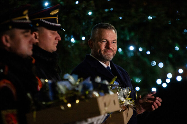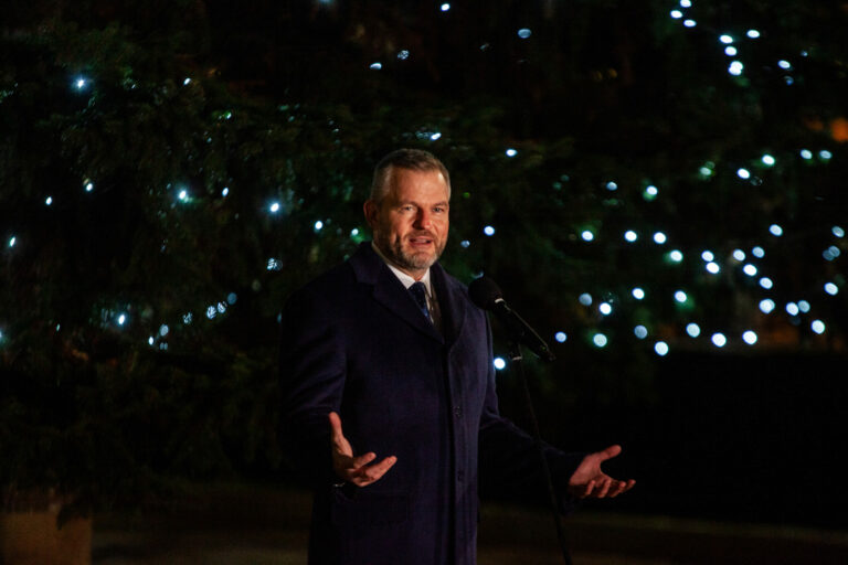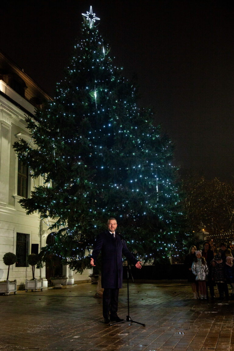 Prezident Peter Pellegrini (vľavo) počas príhovoru pri príležitosti slávnostného rozsvietenia vianočného stromčeka na nádvorí Prezidentského paláca. Bratislava, 6. december 2024. Foto: SITA/Tomáš Bokor