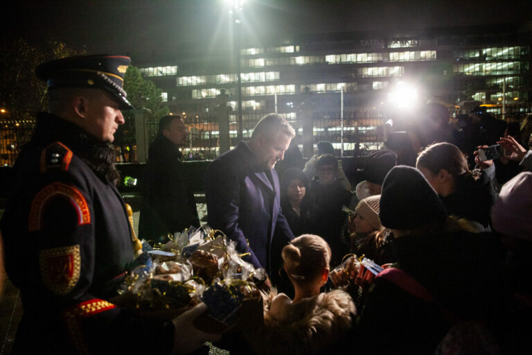 Prezident Peter Pellegrini (vpravo) počas slávnostného rozsvietenia vianočného stromčeka na nádvorí Prezidentského paláca. Bratislava, 6. december 2024. Foto: SITA/Tomáš Bokor