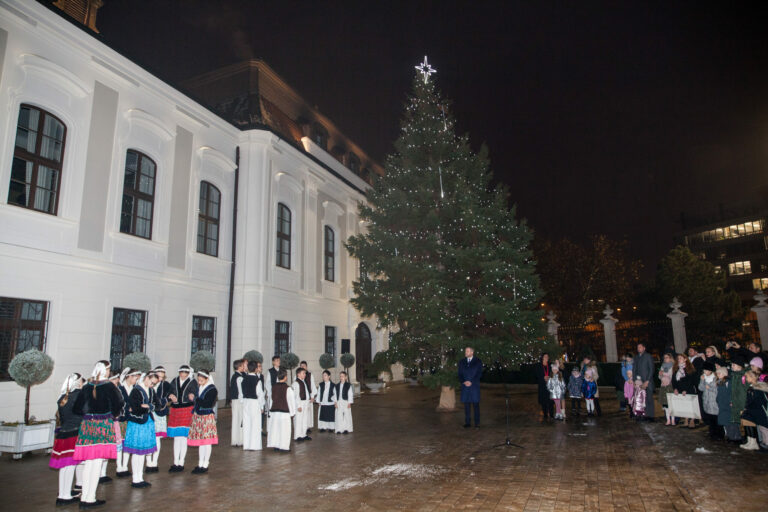 Prezident Peter Pellegrini (uprostred) počas kultúrneho programu detských tanečných súborov pri príležitosti slávnostného rozsvietenia vianočného stromčeka na nádvorí Prezidentského paláca. Bratislava, 6. december 2024. Foto: SITA/Tomáš Bokor