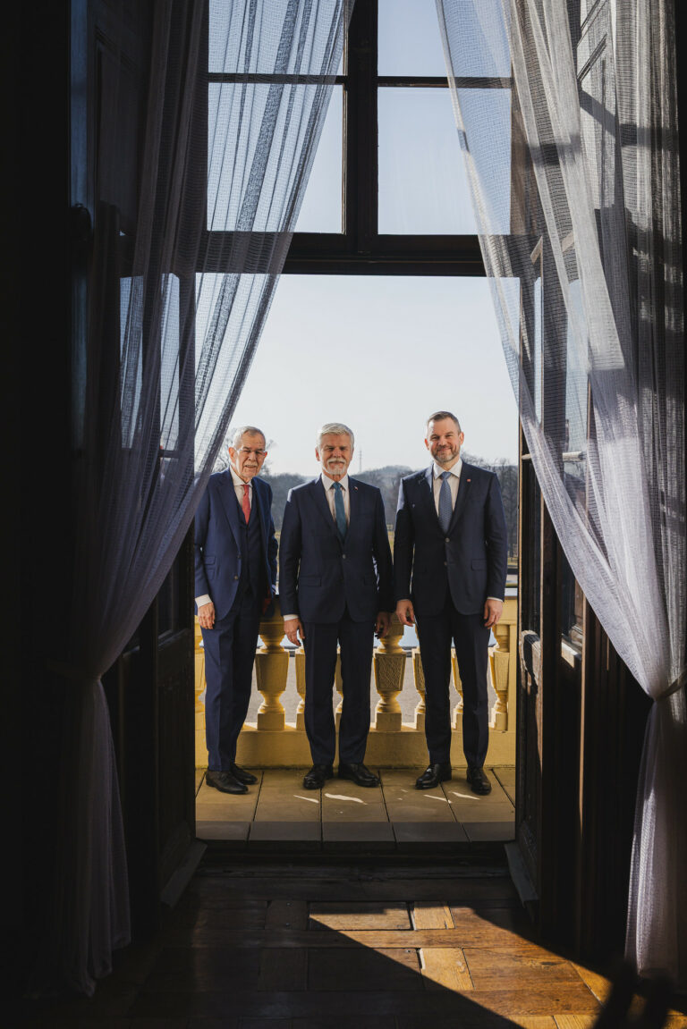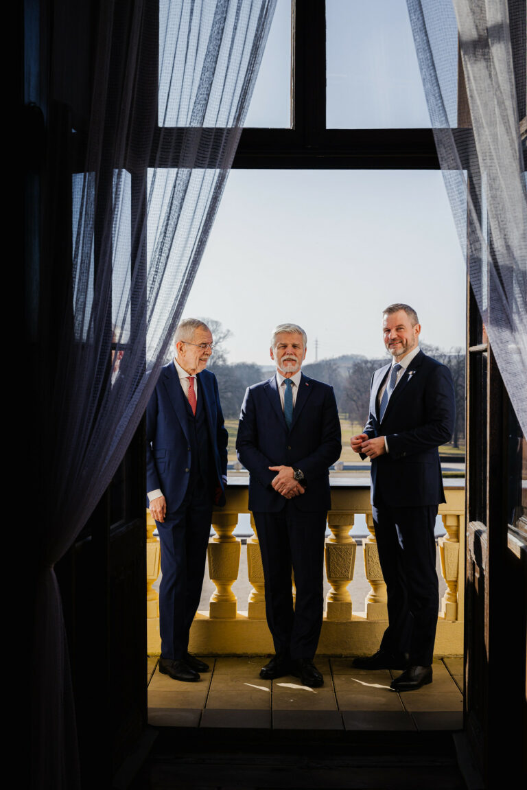 Sprava v popredí: Prezident SR Peter Pellegrini, prezident ČR Petr Pavel a prezident Rakúska Alexander Van der Bellen počas stretnutia na zámku Slavkov pri Brne pri príležitosti okrúhleho 10. výročia podpísania Slavkovskej deklarácie. Brno, 5. marec 2025. Foto: SITA/Kancelária prezidenta