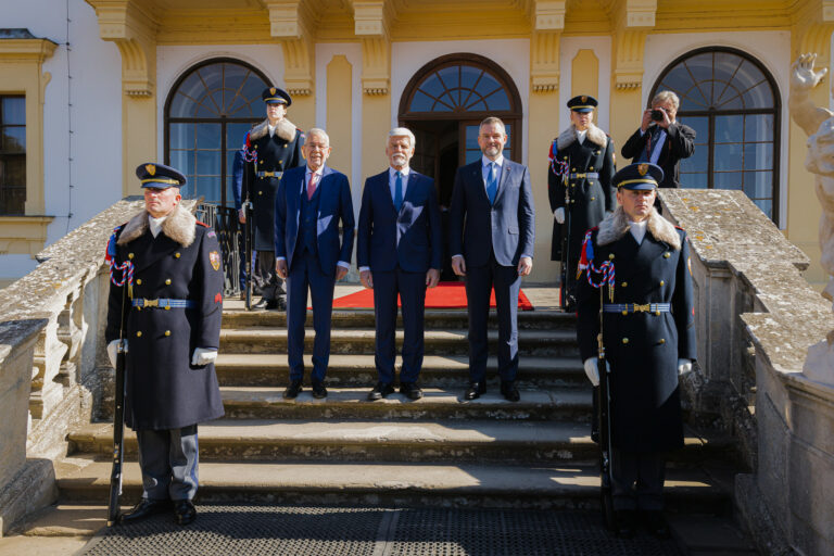 Uprostred sprava: Prezident SR Peter Pellegrini, prezident ČR Petr Pavel a prezident Rakúska Alexander Van der Bellen počas stretnutia na zámku Slavkov pri Brne pri príležitosti okrúhleho 10. výročia podpísania Slavkovskej deklarácie. Brno, 5. marec 2025. Foto: SITA/Kancelária prezidenta