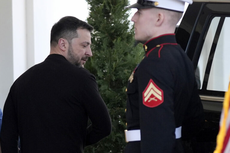 Prezident USA Donald Trump a ukrajinský prezident Volodymyr Zelenskyj vstupujú do Bieleho domu. Washington, 28. február 2025. Foto: SITA/AP