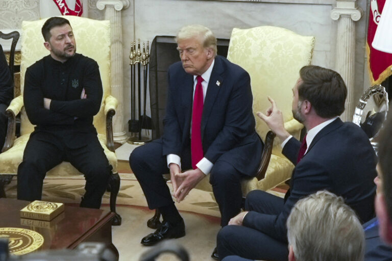Viceprezident JD Vance (vpravo) hovorí s ukrajinským prezidentom Volodymyrom Zelenským (vľavo) počas jeho stretnutia s prezidentom USA Donaldom Trumpom v Oválnej pracovni Bieleho domu. Washington, 28. február 2025. Foto: SITA/AP