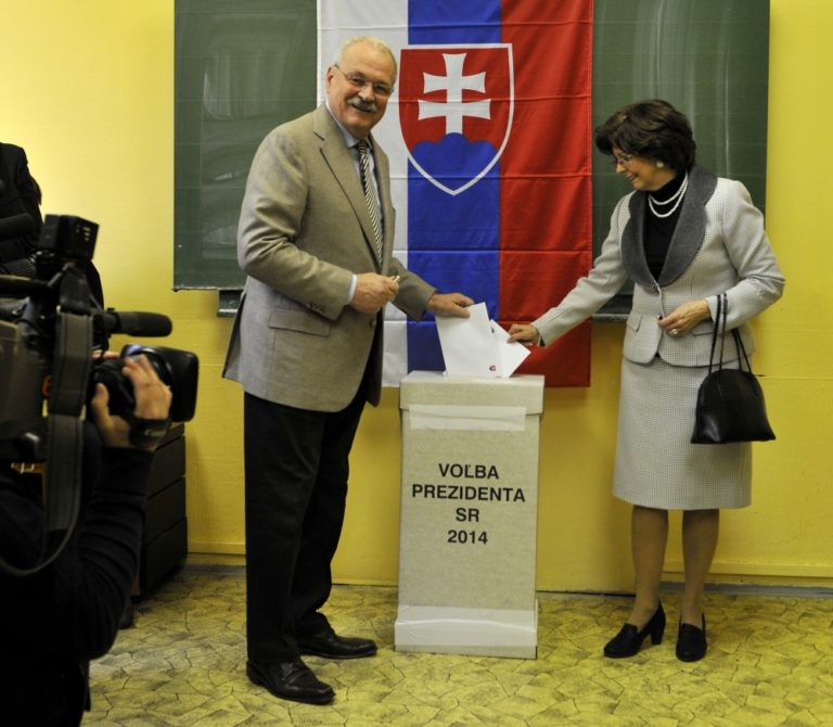 Prezident SR Ivan Gašparovič (vľavo) s manželkou Silviou počas volebného aktu v prezidentských voľbách 2014. Foto: SITA/Ján Slovák