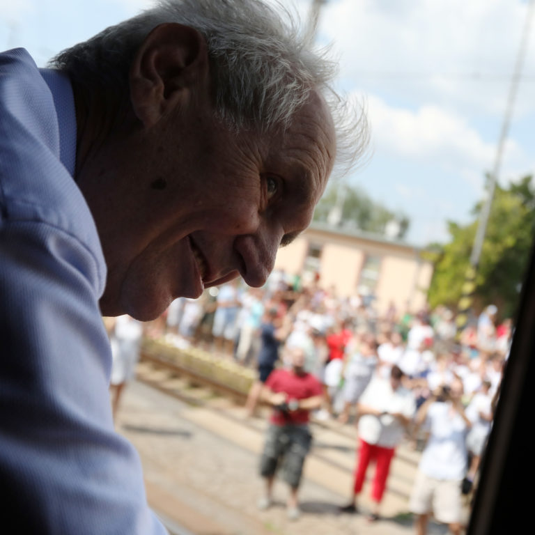 Prezident ČR Miloš Zeman počas príchodu historického vlaku na železničnú stanicu v Sládkovičove, ktorý vezie prezidentov SR a ČR z Hodonína do Topoľčianok v rámci osláv 100. výročia vzniku Československa (ČSR). Bratislava, 29. júl 2018. Foto: SITA/Kancelária prezidenta SR.