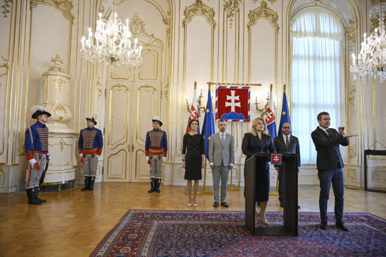 Prezidentka SR Zuzana Čaputová (tretia zľava) počas vyhlásenia v Prezidentskom paláci o ďalšom postupe v súvislosti so schválenou novelou zákonov v oblasti trestného práva. Bratislava, 16. február 2024. Foto: SITA/Milan Illík