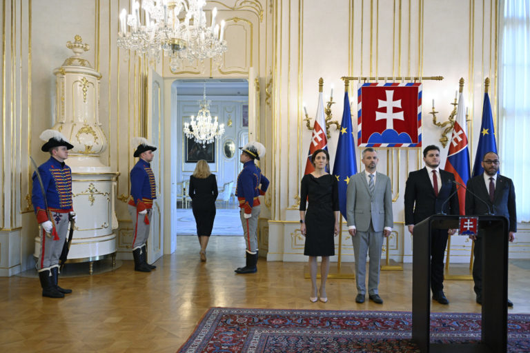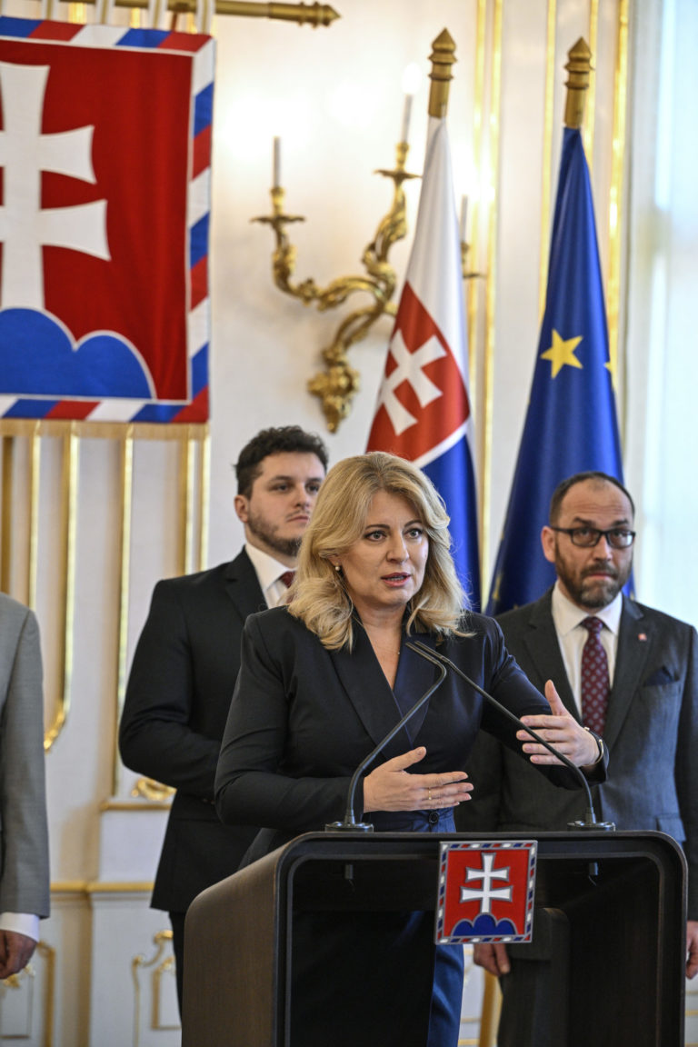 Prezidentka SR Zuzana Čaputová (tretia zľava) po vyhlásení v Prezidentskom paláci o ďalšom postupe v súvislosti so schválenou novelou zákonov v oblasti trestného práva. Bratislava, 16. február 2024. Foto: SITA/Milan Illík