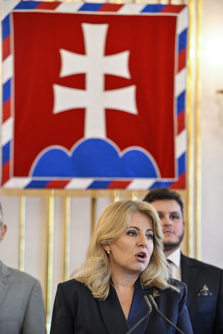 Prezidentka SR Zuzana Čaputová (uprostred) počas vyhlásenia v Prezidentskom paláci o ďalšom postupe v súvislosti so schválenou novelou zákonov v oblasti trestného práva. Bratislava, 16. február 2024. Foto: SITA/Milan Illík