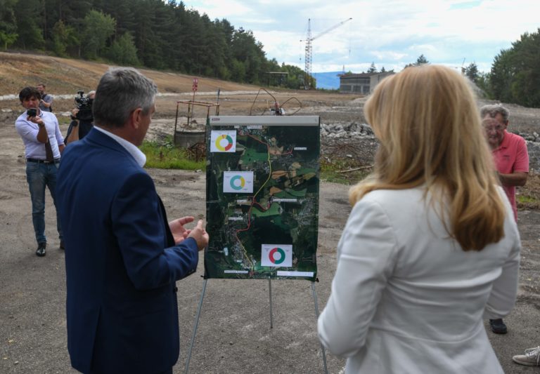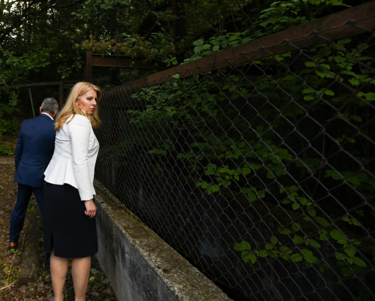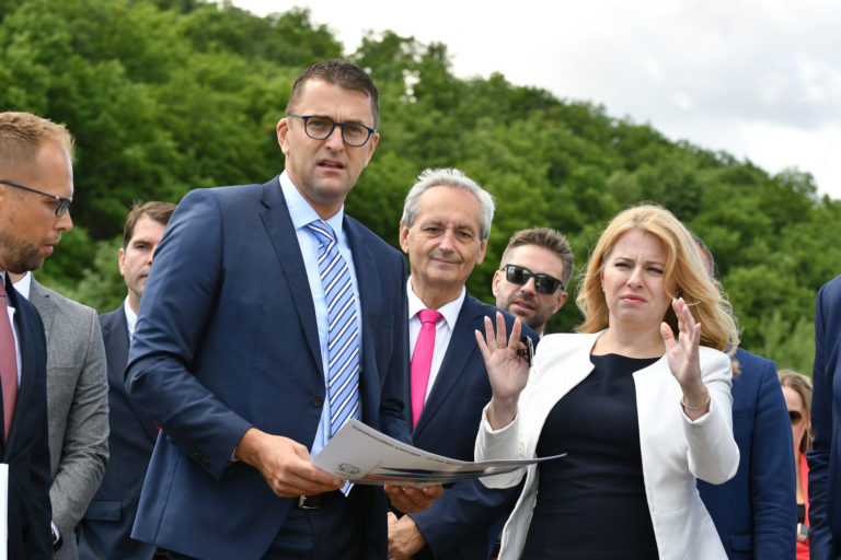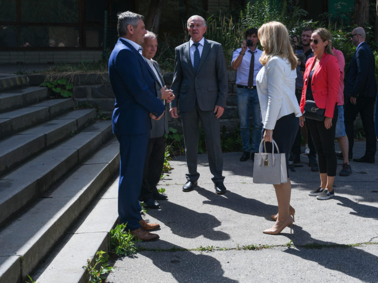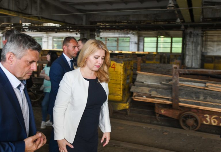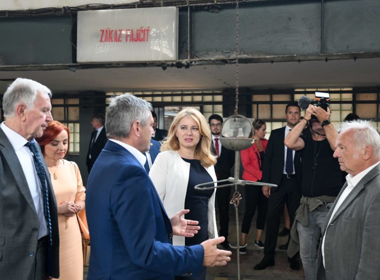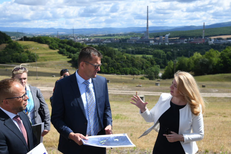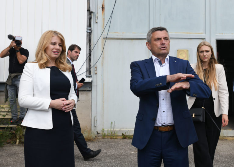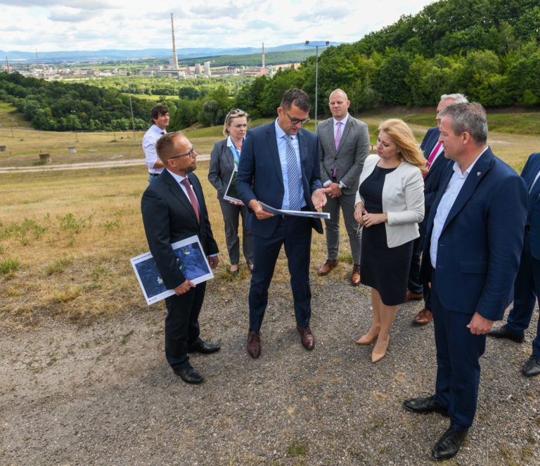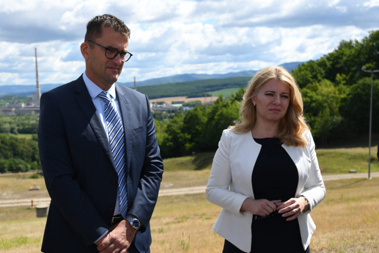 V popredí zľava: Prezidentka SR Zuzana Čaputová a predseda dozornej rady spoločnosti Hornonitrianske bane Prievidza Rastislav Januščák počas prezentácie projektu nového zdroja tepla v areáli Bane Cígeľ v obci Sebedražie v rámci regionálneho výjazdu prezidentky SR na Hornej Nitre. Sebedražie, 12. júl 2022. Foto: SITA/Martin Medňanský