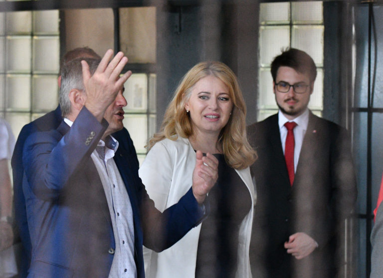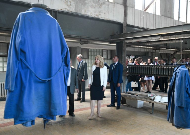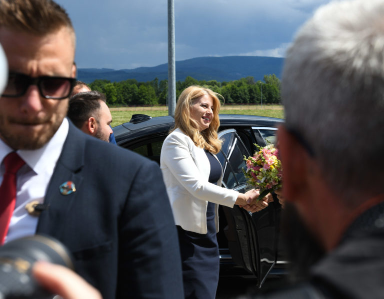 Prezidentka SR Zuzana Čaputová (druhá zľava) počas príchodu na prehliadku do spoločnosti Brose v Prievidzi v rámci regionálneho výjazdu prezidentky SR na Hornej Nitre. Prievidza, 12. júl 2022. Foto: SITA/Martin Medňanský
