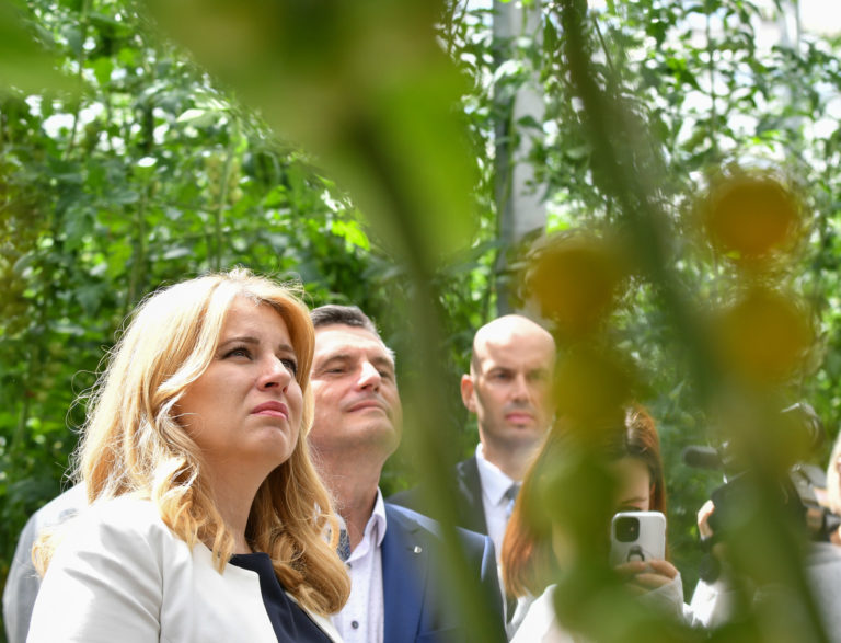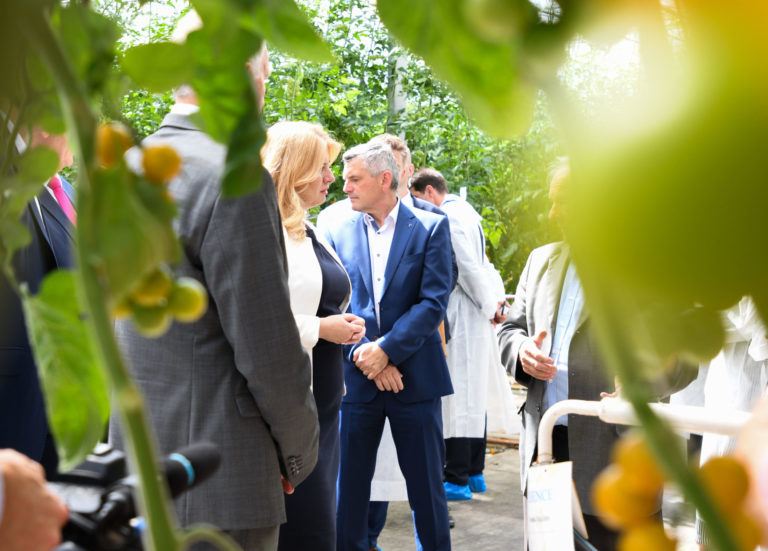 Prezidentka SR Zuzana Čaputová (vpravo) počas prehliadky skleníka s paradajkami dcérskej spoločnosti Hornonitrianskych baní Agro GTV v Novákoch v rámci regionálneho výjazdu na Hornej Nitre. Nováky, 12. júl 2022. Foto: SITA/Martin Medňanský