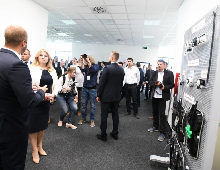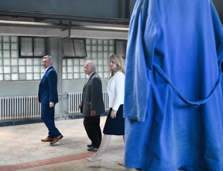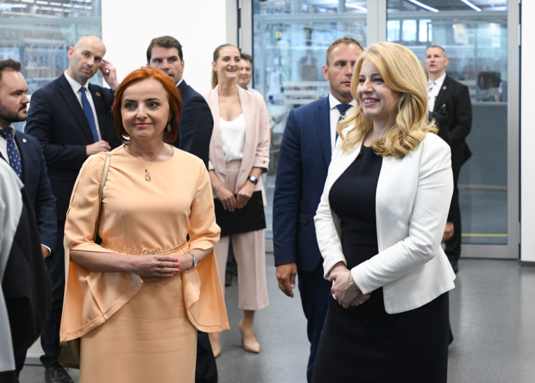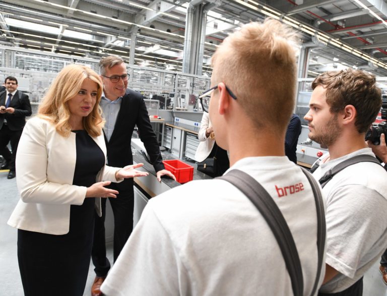 Zľava v popredí: Prezidentka SR Zuzana Čaputová a riaditeľ spoločnosti Brose Prievidza Axel Mallener počas prehliadky dielne duálneho vzdelávania a oddelenia pre výskum a vývoj v spoločnosti Brose v Prievidzi v rámci regionálneho výjazdu prezidentky SR na Hornej Nitre. Prievidza, 12. júl 2022. Foto: SITA/Martin Medňanský