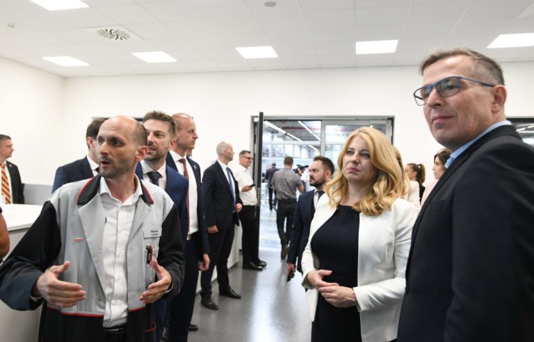 Zľava: Riaditeľ spoločnosti Brose Prievidza Axel Mallener a prezidentka SR Zuzana Čaputová počas prehliadky dielne duálneho vzdelávania a oddelenia pre výskum a vývoj v spoločnosti Brose v Prievidzi v rámci regionálneho výjazdu prezidentky SR na Hornej Nitre. Prievidza, 12. júl 2022. Foto: SITA/Martin Medňanský