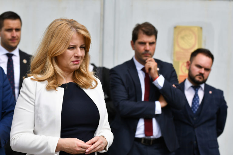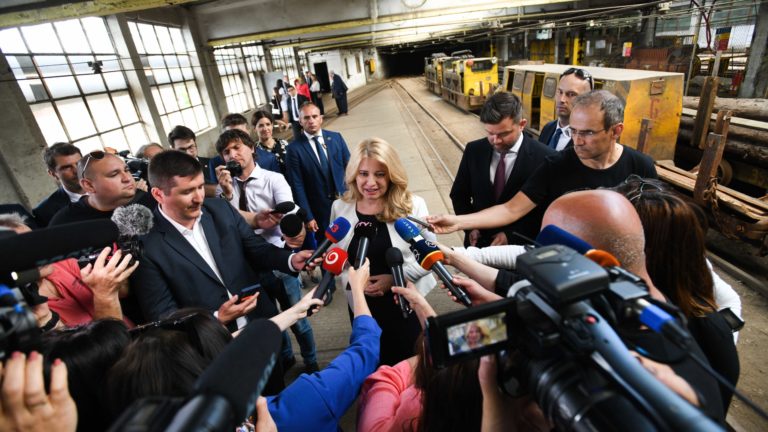 Prezidentka SR Zuzana Čaputová (uprostred) počas brífingu po prezentácii projektu nového zdroja tepla v areáli Bane Cígeľ v obci Sebedražie v rámci regionálneho výjazdu prezidentky SR na Hornej Nitre. Sebedražie, 12. júl 2022. Foto: SITA/Martin Medňanský