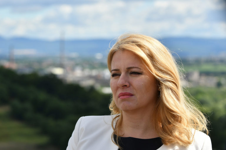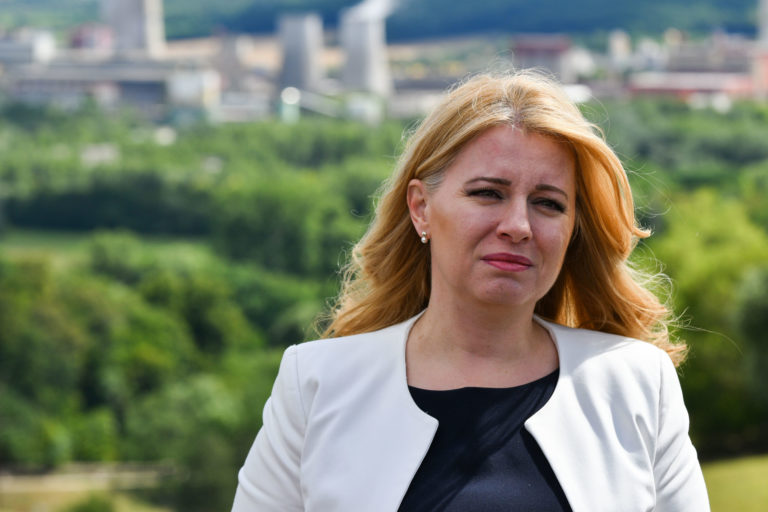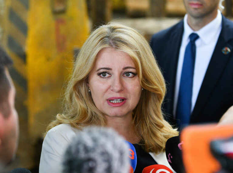 Prezidentka SR Zuzana Čaputová počas brífingu po prezentácii projektu nového zdroja tepla v areáli Bane Cígeľ v obci Sebedražie v rámci regionálneho výjazdu prezidentky SR na Hornej Nitre. Sebedražie, 12. júl 2022. Foto: SITA/Martin Medňanský