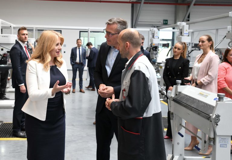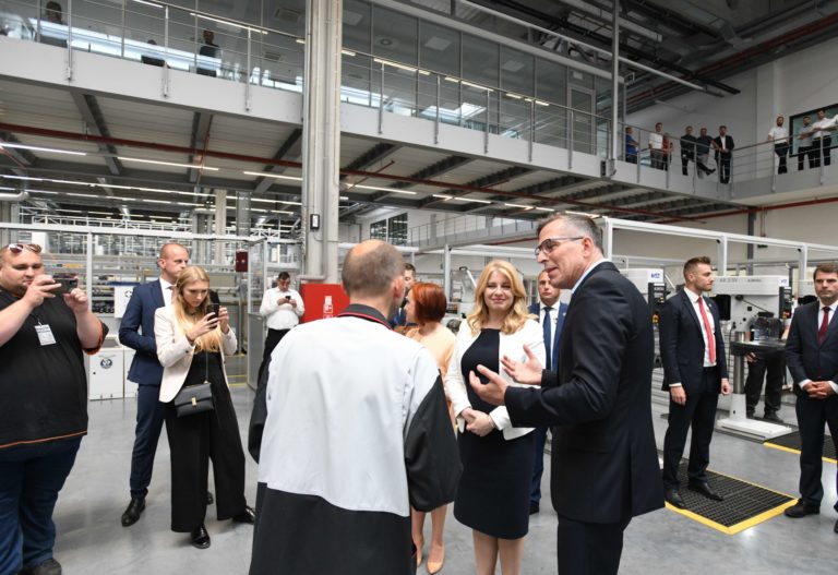 Sprava: Prezidentka SR Zuzana Čaputová a riaditeľ spoločnosti Brose Prievidza Axel Mallener počas prehliadky dielne duálneho vzdelávania a oddelenia pre výskum a vývoj v spoločnosti Brose v Prievidzi v rámci regionálneho výjazdu prezidentky SR na Hornej Nitre. Prievidza, 12. júl 2022. Foto: SITA/Martin Medňanský