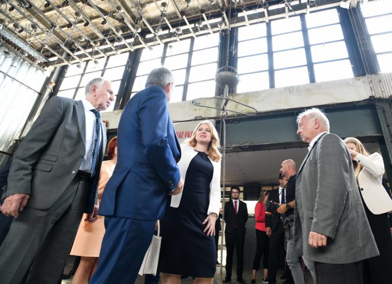 Prezidentka SR Zuzana Čaputová (vpravo) počas prezentácie projektu nového zdroja tepla v areáli Bane Cígeľ v obci Sebedražie v rámci regionálneho výjazdu na Hornej Nitre. Sebedražie, 12. júl 2022. Foto: SITA/Martin Medňanský
