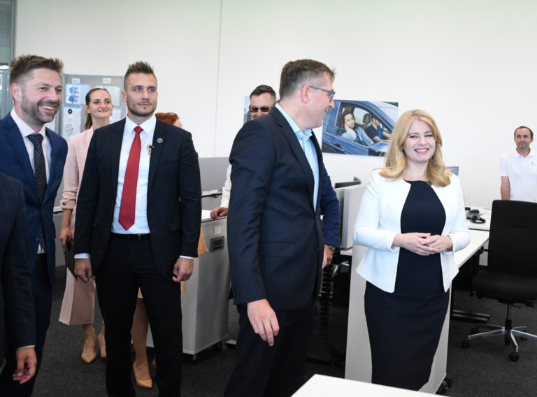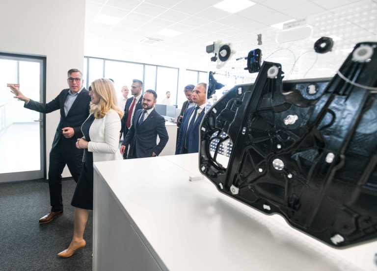 Prezidentka SR Zuzana Čaputová (tretia zľava) počas prehliadky dielne duálneho vzdelávania a oddelenia pre výskum a vývoj v spoločnosti Brose v Prievidzi v rámci regionálneho výjazdu prezidentky SR na Hornej Nitre. Prievidza, 12. júl 2022. Foto: SITA/Martin Medňanský