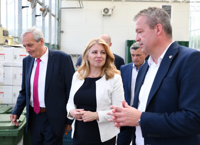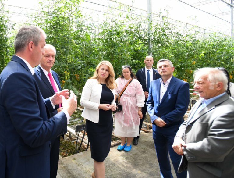 Prezidentka SR Zuzana Čaputová (uprostred) počas prehliadky skleníka s paradajkami dcérskej spoločnosti Hornonitrianskych baní Agro GTV v Novákoch v rámci regionálneho výjazdu na Hornej Nitre. Nováky, 12. júl 2022. Foto: SITA/Martin Medňanský