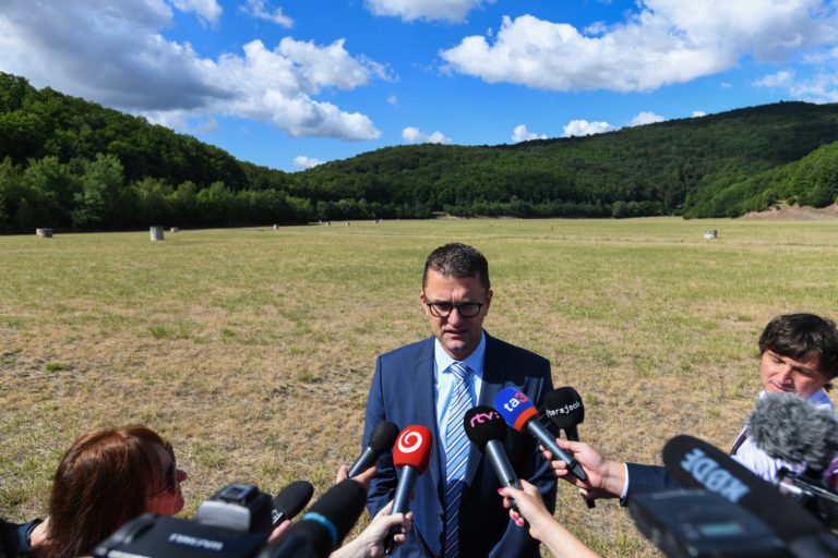Generálny riaditeľ Slovenských elektrární (SE) Branislav Strýček (uprostred) odpovedá na otázky novinárov počas predstavenia projektu solárneho parku v areáli pôvodného odkaliska Slovenských elektrární v Zemianskych Kostoľanoch za účasti prezidentky SR pri príležitosti jej regionálneho výjazdu na Hornej Nitre. Zemianske Kostoľany, 12. júl 2022. Foto: SITA/Martin Medňanský