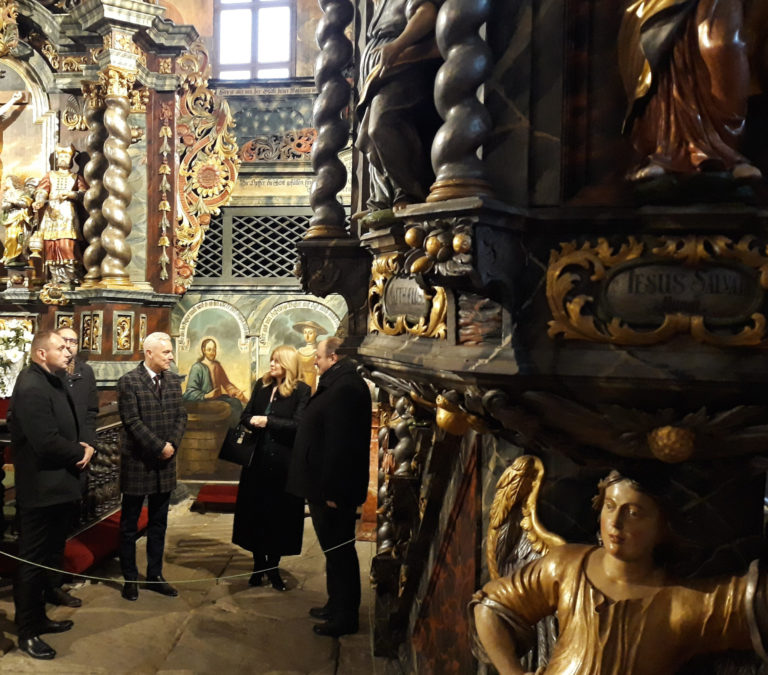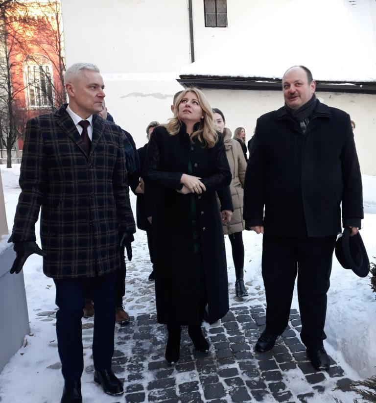 V popredí sprava: Evanjelický farár Roman Porubän, prezidentka SR Zuzana Čaputová a primátor Kežmarku Ján Ferenčák počas prehliadky Dreveného artikulárneho kostola v Kežmarku pri príležitosti regionálneho výjazdu prezidentky SR na Spiši. Kežmarok, 8. február 2023. Foto: SITA/Mária Frisová