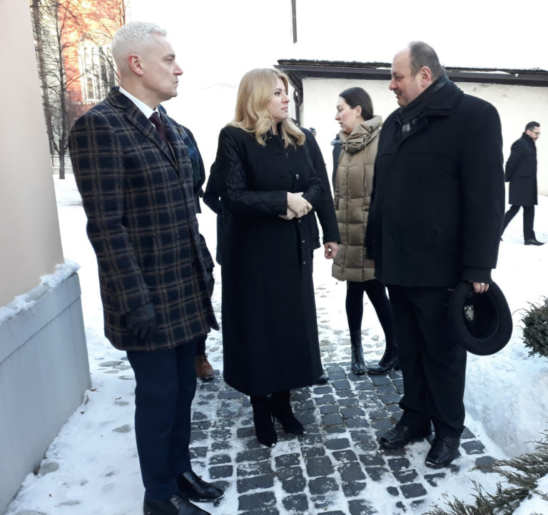 Zľava: Prezidentka SR Zuzana Čaputová a primátor Kežmarku Ján Ferenčák počas rozhovoru s médiami v Kežmarku pri príležitosti regionálneho výjazdu prezidentky SR na Spiši. Kežmarok, 8. február 2023. Foto: SITA/Mária Frisová