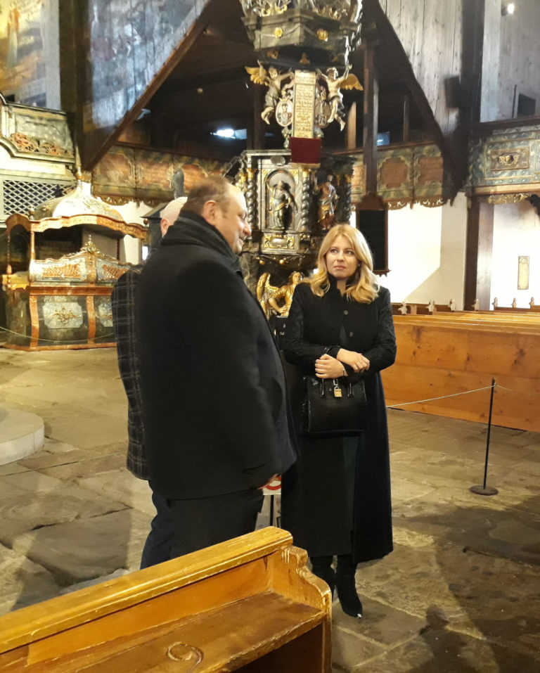 Sprava: Prezidentka SR Zuzana Čaputová a evanjelický farár Roman Porubän počas prehliadky Dreveného artikulárneho kostola v Kežmarku pri príležitosti regionálneho výjazdu prezidentky SR na Spiši. Kežmarok, 8. február 2023. Foto: SITA/Mária Frisová