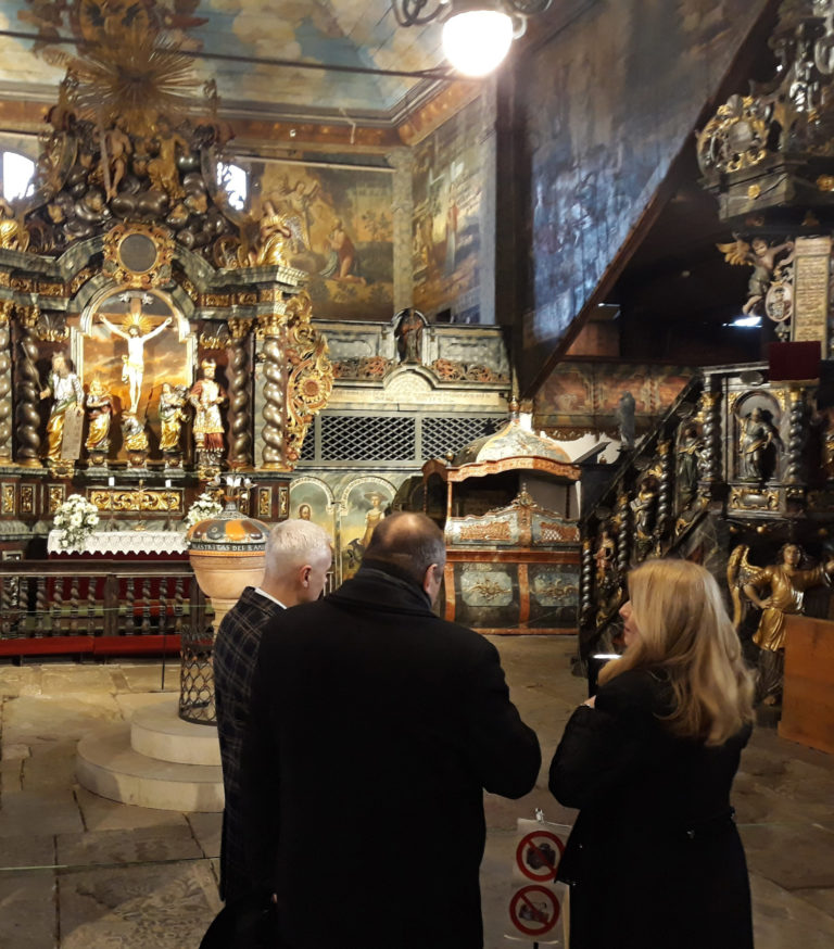 Sprava: Prezidentka SR Zuzana Čaputová, evanjelický farár Roman Porubän a primátor Kežmarku Ján Ferenčák počas prehliadky Dreveného artikulárneho kostola v Kežmarku pri príležitosti regionálneho výjazdu prezidentky SR na Spiši. Kežmarok, 8. február 2023. Foto: SITA/Mária Frisová