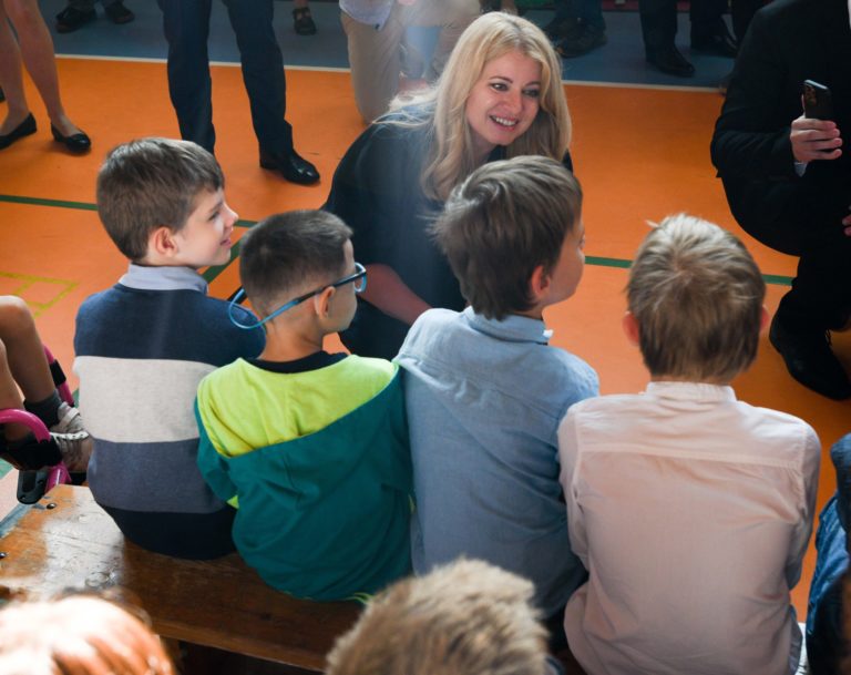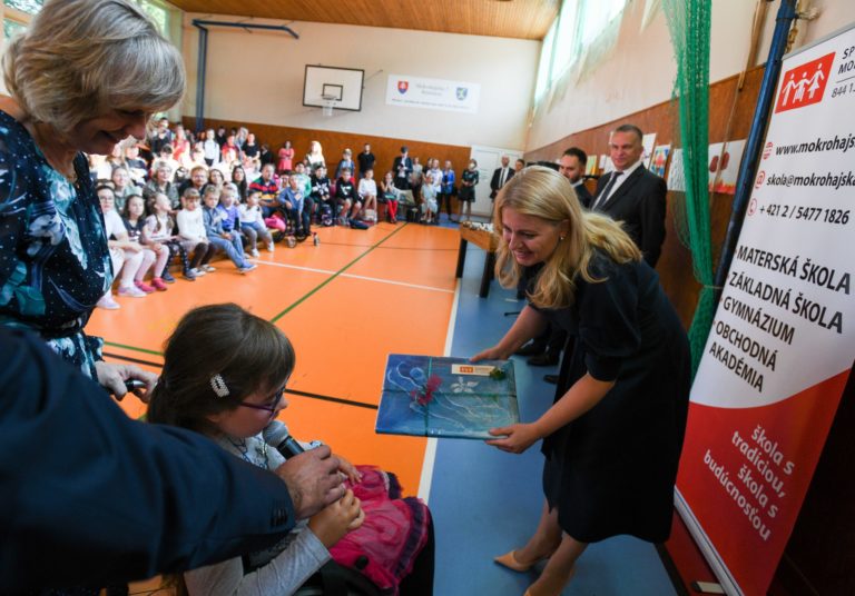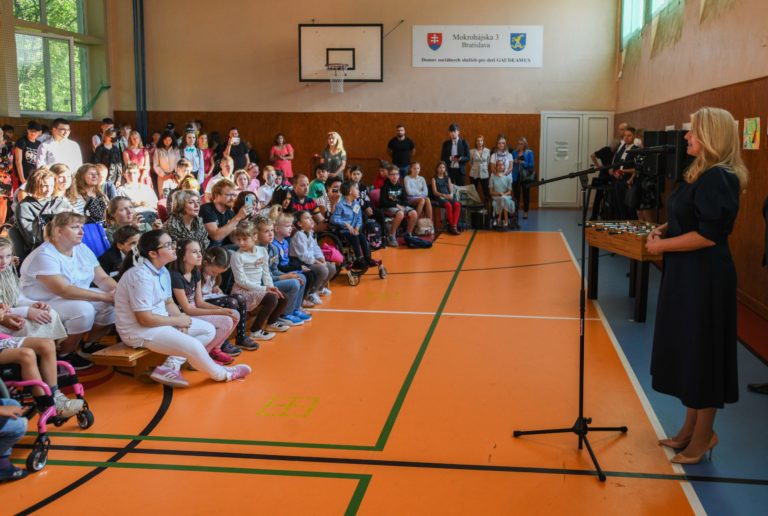 Prezidentka Zuzana Čaputová (tretia zľava) počas otvorenia nového školského roku 2022/2023 na Spojenej škole Mokrohájska v Bratislave. Foto: SITA/Martin Medňanský