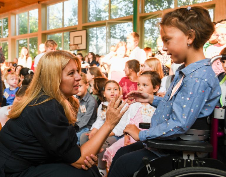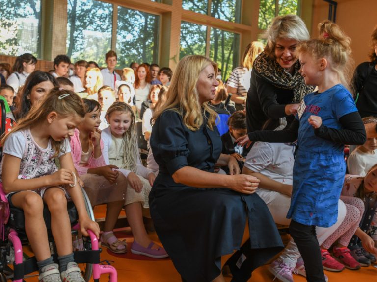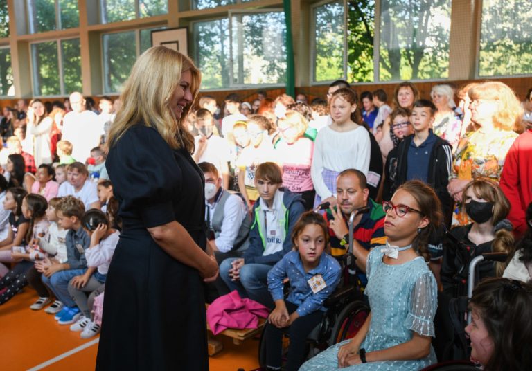 Zľava: Prezidentka SR Zuzana Čaputová so žiakmi počas otvorenia nového školského roku 2022/2023 na Spojenej škole Mokrohájska v Bratislave. Foto: SITA/Martin Medňanský