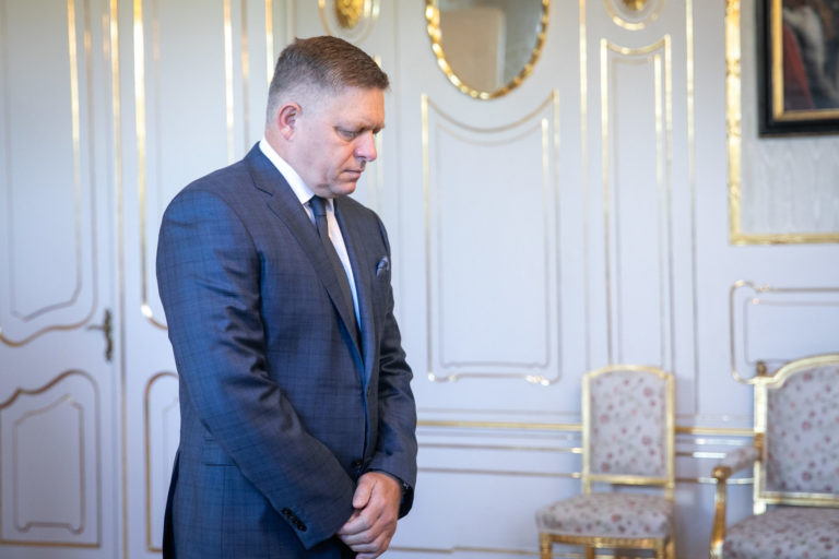 Predseda strany Smer-SSD Robert Fico počas poverenia na zostavenie vlády SR prezidentkou SR v Prezidentskom paláci po predčasných voľbách do Národnej rady SR. Bratislava, 2. október 2023. Foto: SITA/Diana Černaková