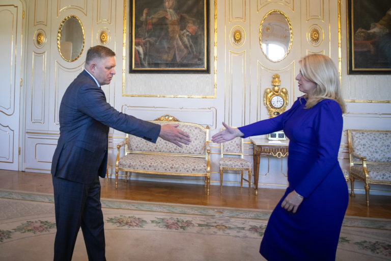 Sprava: Prezidentka SR Zuzana Čaputová a predseda strany Smer-SSD Robert Fico počas poverenia predsedu strany SMER - slovenská sociálna demokracia na zostavenie vlády SR po predčasných voľbách do Národnej rady SR. Bratislava, 2. október 2023. Foto: SITA/Diana Černaková
