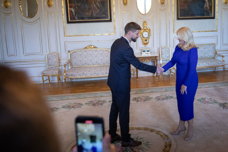Sprava: Prezidentka SR Zuzana Čaputová a predseda hnutia Progresívne Slovensko (PS) Michal Šimečka počas prijatia v Prezidentskom paláci po predčasných voľbách do Národnej rady SR. Bratislava, 2. október 2023. Foto: SITA/Diana Černak