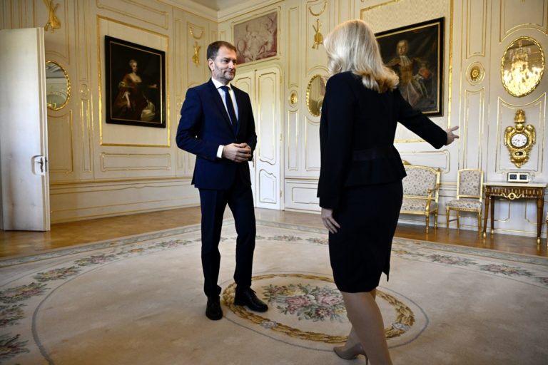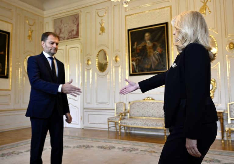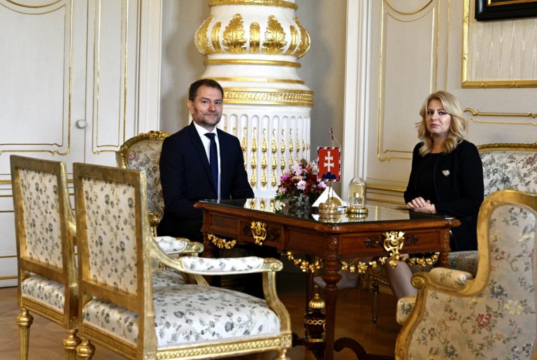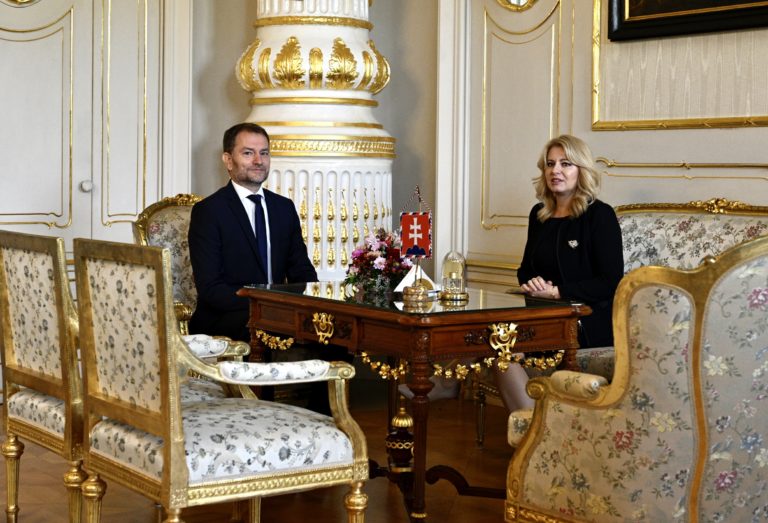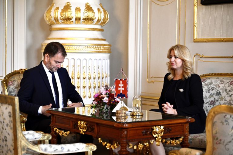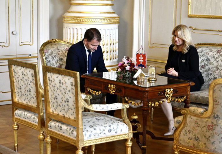 Sprava: Prezidentka SR Zuzana Čaputová a predseda hnutia OĽANO a priatelia Igor Matovič počas prijatia v Prezidentskom paláci po predčasných voľbách do Národnej rady SR. Bratislava, 5. október 2023. Foto: SITA/Milan Illík
