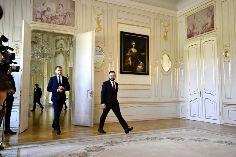 Predseda hnutia OĽANO a priatelia Igor Matovič počas prijatia prezidentkou SR v Prezidentskom paláci po predčasných voľbách do Národnej rady SR. Bratislava, 5. október 2023. Foto: SITA/Milan Illík