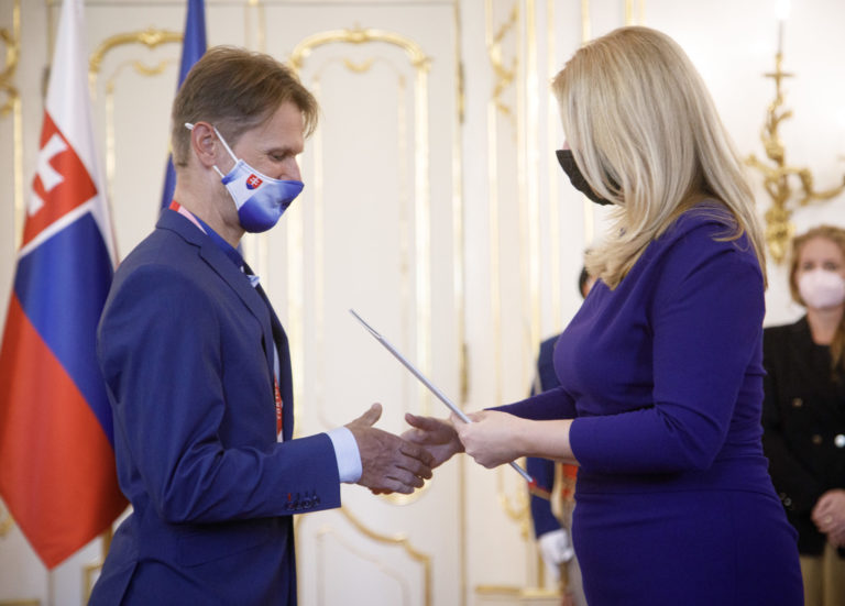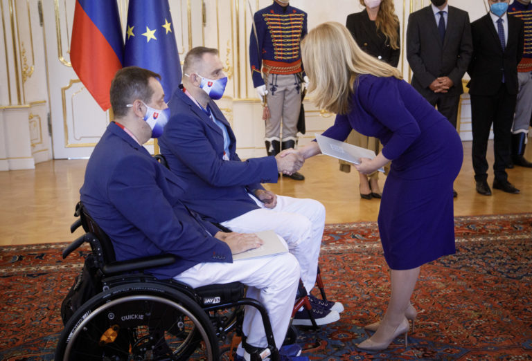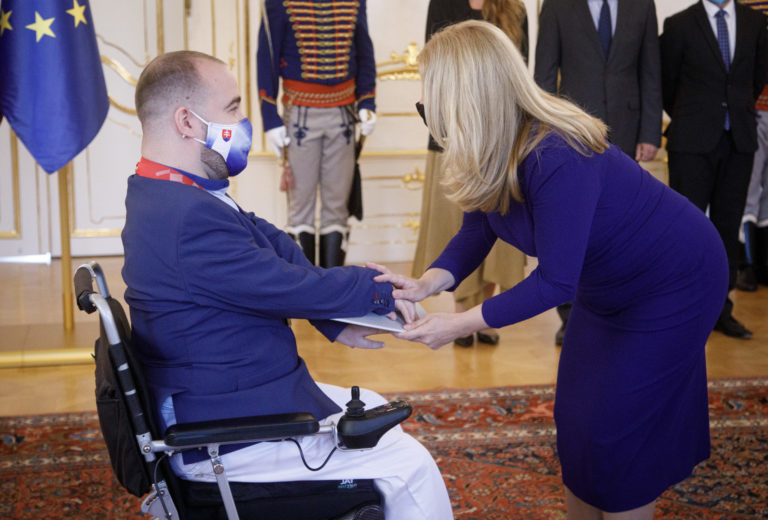Zľava: Slovenský paralympijský reprezentant v boccii Samuel Andrejčík a prezidenta SR Zuzana Čaputová počas prijatia členov slovenskej paralympijskej výpravy, ktorí získali medaily na XVI. letných paralympijských hrách v Tokiu. Bratislava, 10. september 2021. Foto: SITA/Branislav Bibel