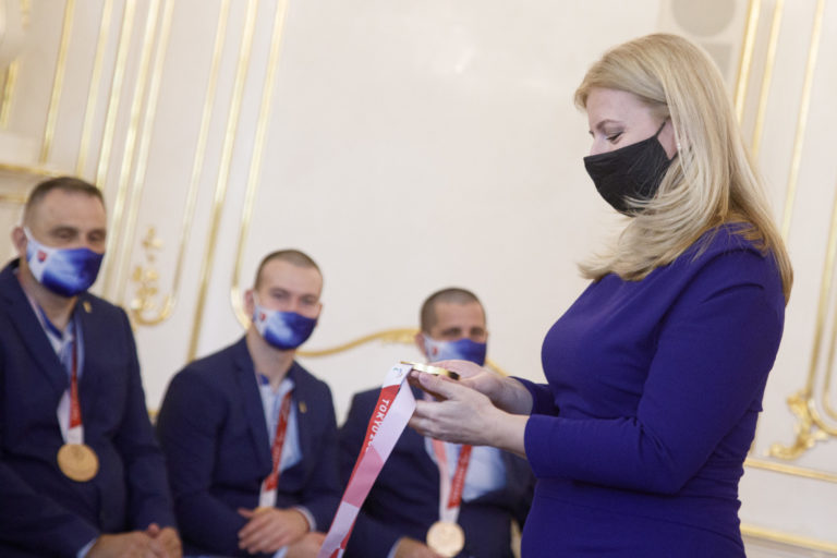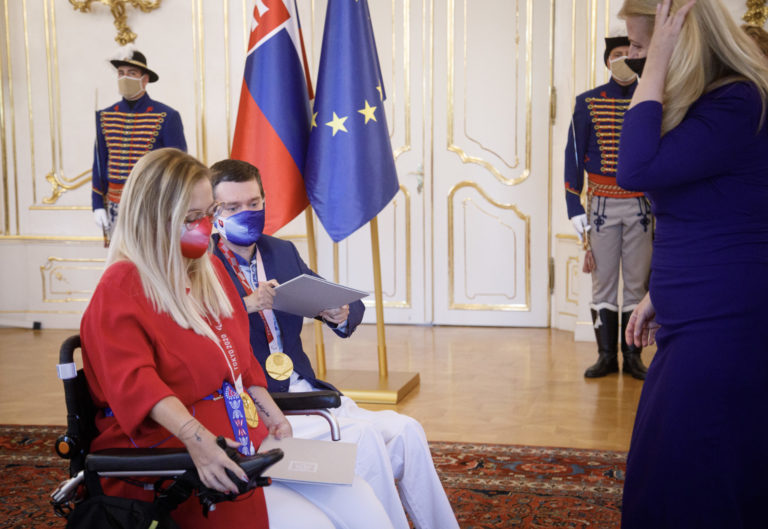 Preziednka SR Zuzana Čaputová so zlatou medailou počas prijatia členov slovenskej paralympijskej výpravy, ktorí získali medaily na XVI. letných paralympijských hrách v Tokiu. Bratislava, 10. september 2021. Foto: SITA/Branislav Bibel