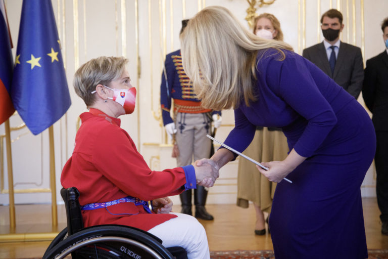 Zľava: Slovenský reprezentant v cestnej paracyklistike Patrik Kuril a preziednka SR Zuzana Čaputová počas prijatia členov slovenskej paralympijskej výpravy, ktorí získali medaily na XVI. letných paralympijských hrách v Tokiu. Bratislava, 10. september 2021. Foto: SITA/Branislav Bibel